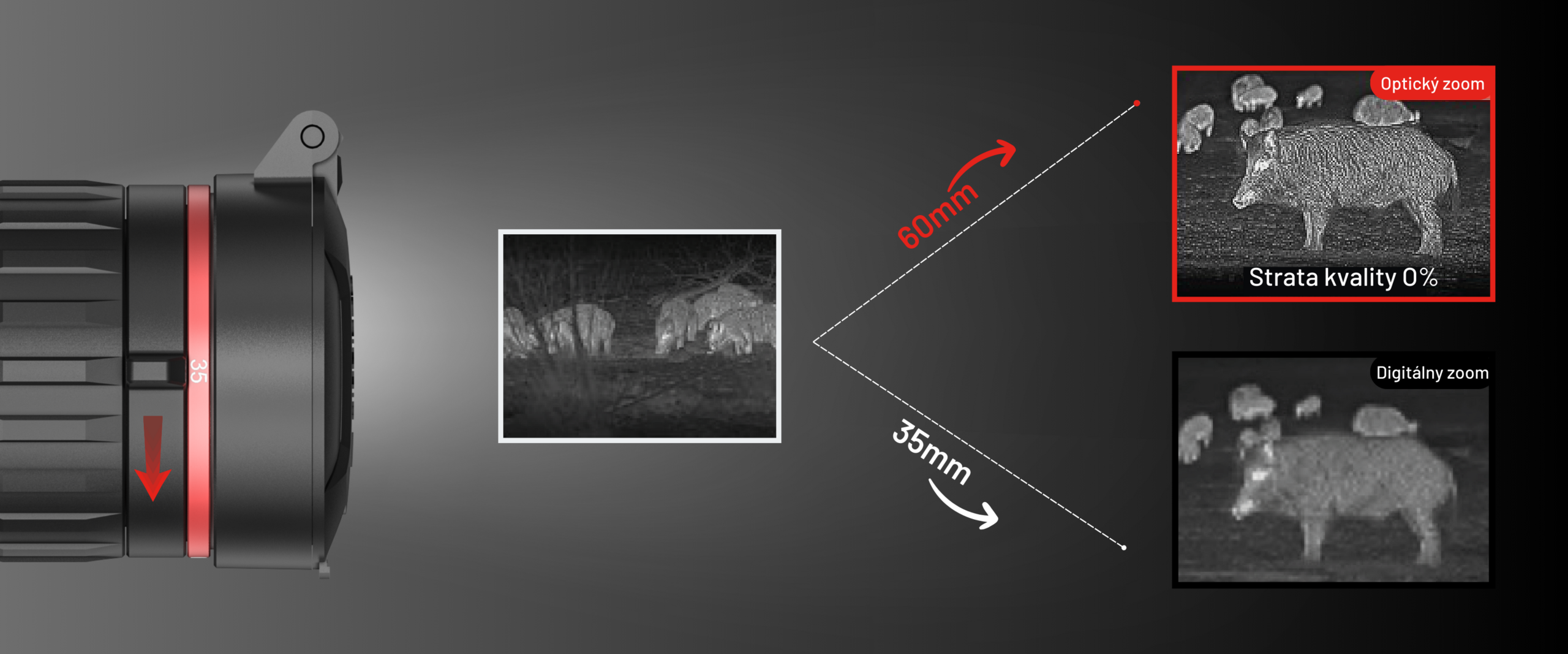 Funkcia optického zoomu spočíva v dvoch šošovkách v jednom prístroji, vďaka ktorým si môžete meniť šírku zorného poľa podľa Vašej potreby. Šošovka s ohniskovou vzdialenosťou 35 mm s pevným optickým zväčšením 1,8x dáva zameriavaču možnosť detekcie na 1800 metrov a šošovka s ohniskovou vzdialenosťou 60 mm so zväčšením 3,1x až na 3000 metrov.