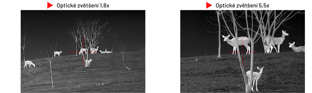 Variabilné optické zväčšenie je to, čo robí tento termovízny puškohľad výnimočným. Vďaka tomu má dve zorné polia, ktoré dokonale spĺňajú požiadavky lovu na kratšie aj dlhšie vzdialenosti. Ares je, samozrejme, vybavený aj plynulým digitálnym zoomom až 6x a funkciou, ktorá zabezpečuje, že kríž zostane vždy v strede obrazovky, aj keď sa pri nastreľovaní musíte posunúť mimo stredu. Samotné nastrelenie sa vykonáva manuálne pomocou funkcie Freeze, ktorá zmrazí obraz a umožní vám pohodlne nastaviť polohu zameriavacieho kríža, alebo automaticky, keď Ares sám mení polohu zameriavacieho kríža podľa tepelnej stopy po dopade strely.